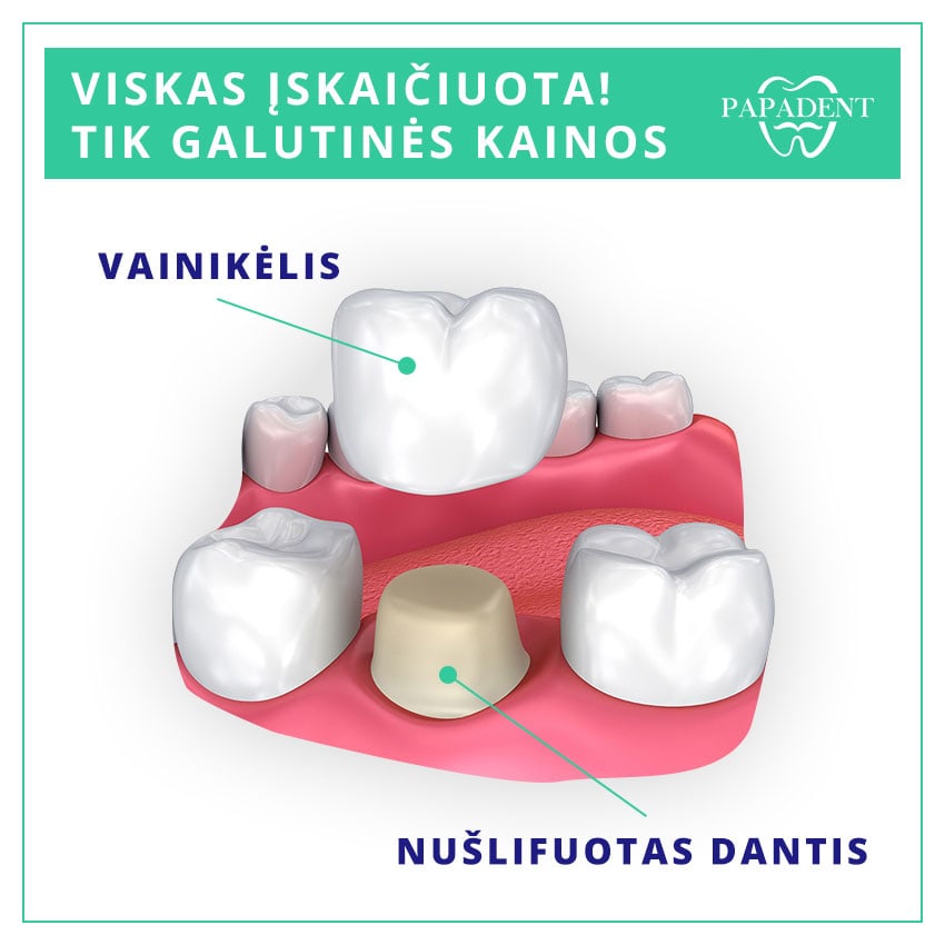 *-kaina galioja, jei protezavimas ant implantų pradedamas per 6 – 9 mėnesius nuo implantacijos datos ir atliekamas ne skubos tvarka pagal esamą klinikos užimtumą.