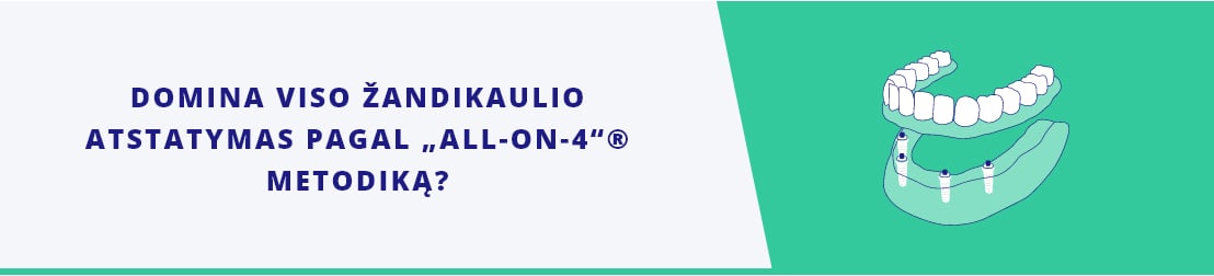 Dantų ir šaknų šalinimas, implantacija yra atliekama vieno vizito metu, kitą dieną prie implantų prifiksuojami nauji dantys. Gleivinė susiuvama tirpstančiais siūlais, jie per 2 – 3 savaites ištirpsta. Praėjus 2 mėnesiams po implantacijos rekomenduojame atvykti į kontrolinį vizitą, jei nėra galimybės atvykti į Lietuvą, reikėtų pasidaryti kontrolinę žandikaulio panoraminę nuotrauką ir atsiųsti ją elektroniniu paštu.