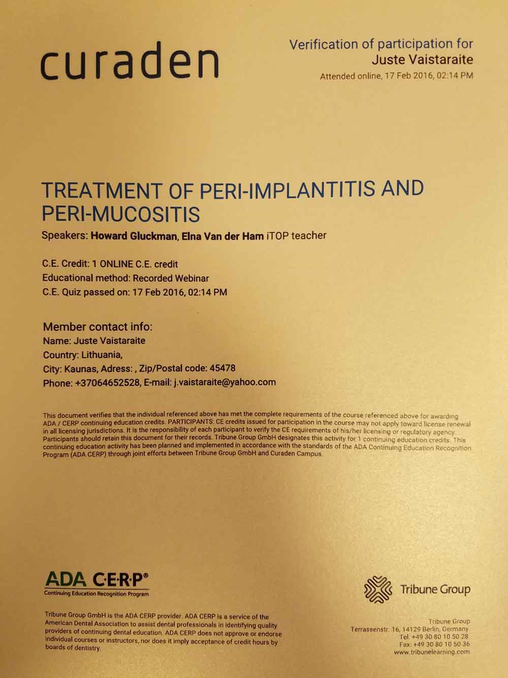 - 2016 02 17 „Treatment of peri – implantitis and per – mucositis“ Kaunas, Lietuva