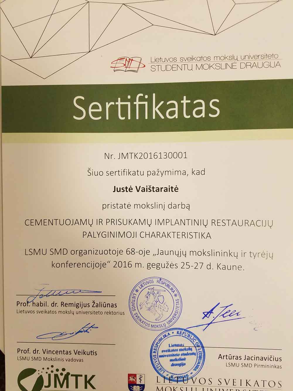 - 2016 05 25 – 27 mokslinis darbas „Cementuojamų ir prisukamų implantinių restauracijų palyginamoji charakteristika“ Kaunas, Lietuva