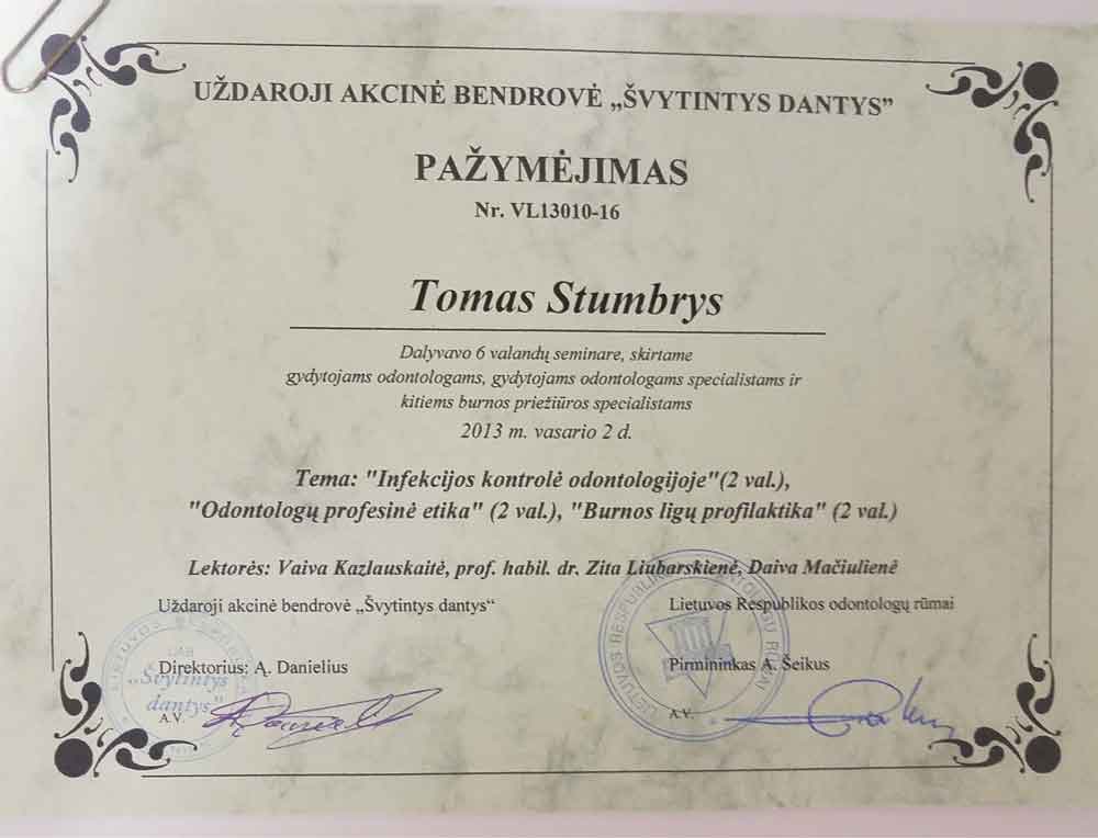 - 2013 12 05 “Minimaliai invazyvus gydymo metodai dantu implantologijoje” Klaipėda, Lietuva