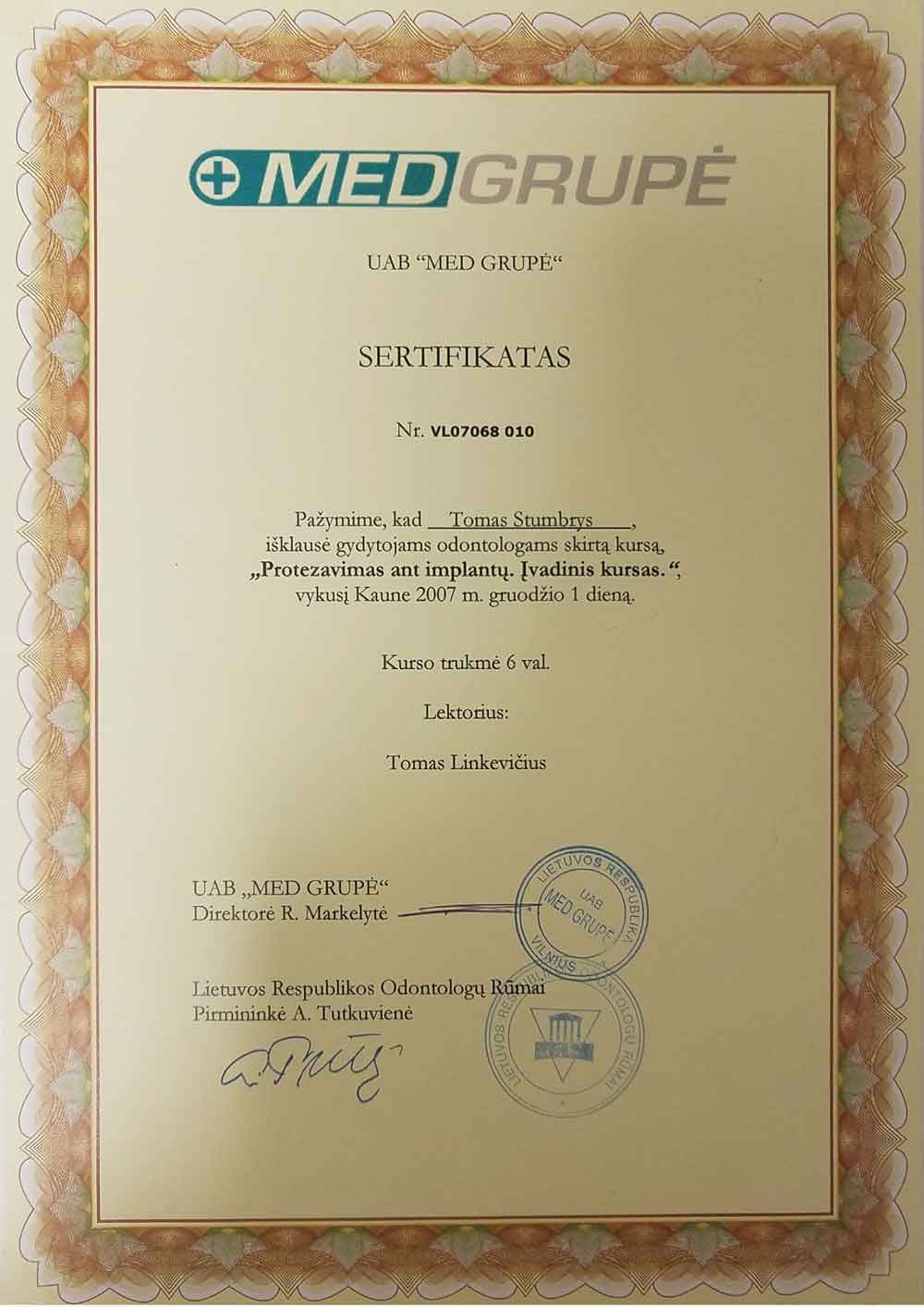 - 2007 12 01 “Protezavimas ant implantų. Įvadinis kursas”, Vilnius Lietuva