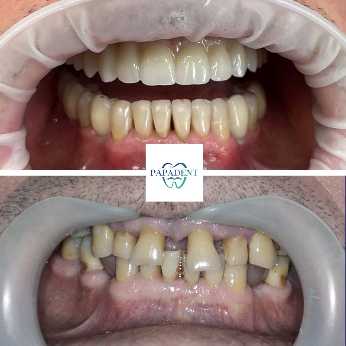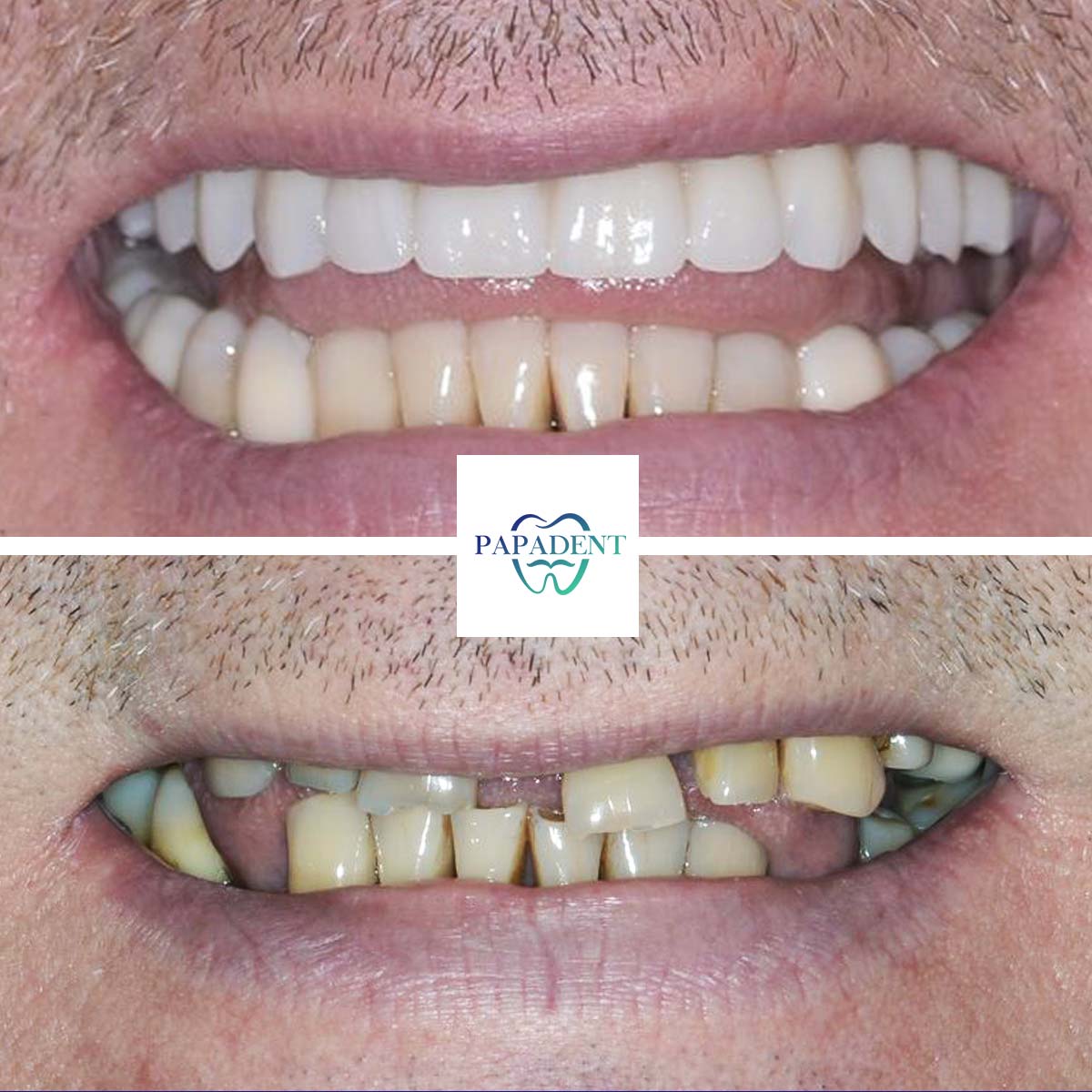 Statybų profesionalas, daugelį metų neskyręs pakankamai dėmesio savo burnos sveikatai, kreipėsi į „PAPADENT“ odontologijos kliniką. Po išsamios apžiūros buvo nuspręsta, kad 11 viršutinio žandikaulio dantų reikia šalinti dėl jų prastos būklės.